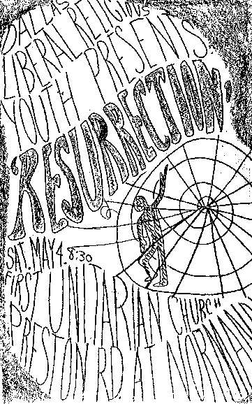 This Youth Sunday was preformed twice, once as a regular church service on March 31, 1968 (the same day LBJ announced he wasn't running for another term) and again at night for the new minister, Dwight Brown on May 4 at the First Unitarian Church of Dallas. The cover graphic below is from the order of service for the second service, which was printed on paper the color of this page. The text below is from the order of service for the first service and it was printed on the usual order of service stock, so it did not have the graphic. To get the most out of the cybercast, you should read through the description of the program, so you'll have some idea of the visual aspects of the program. Information about the cybercast will follow.