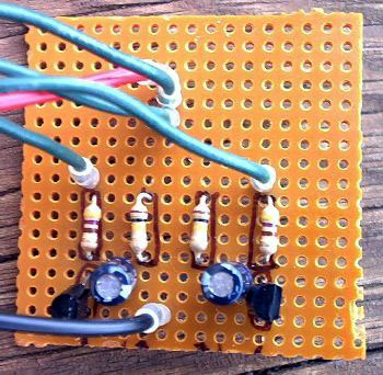 On this circuit, the green wires connect to the LEDs, but you can mount them on the actual circuit board for some applications. The picture is about twice actual size. Here is an example of the use of this circuit: