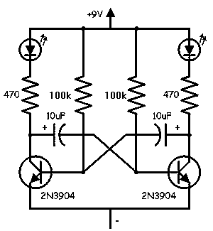 This circuit has a lot going for it. For one thing, it only consists of two transistors, two capacitors and four resistors. That also means it consumes very little power. You can control the flash rate by changing the size of the 100k resistors (100k makes for a pretty slow rate). You can also control the duty cycle by using resistors of different values on the two sides. The 470 ohm resistors control the current through the LEDs. Normally you want to limit this to 20mA, but to conserve battery power, you may need to limit it even further. You can also connect several LEDs in series, instead of using only one for each side. With red LEDs (1 per side) and the values shown, the circuit draws about 11mA. Here's what the actual circuit looks like: